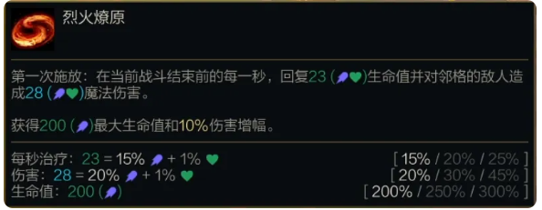 第一次施放:在当前战斗结束前的每一秒,回复(15%/20%/25%法术强度 +1%最大生命值)生命值并对邻格的敌人造成28(20%/30%/45%法术强度 +1%最大生命值)魔法伤害。