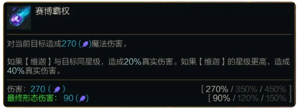 如果【维迦】与目标同星级,造成20%真实伤害。如果【维迦】的星级更高,造成40%真实伤害。