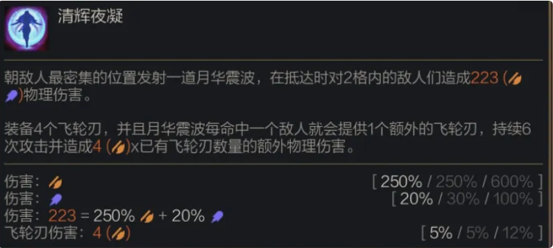 朝敌人最密集的位置发射一道月华震波,在抵达时对2格内的敌人们造成(250%/250%/600%攻击力 + 20%/30%/100%法术强度)物理伤害。