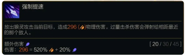 放出狼灵攻击当前目标,造成(520%攻击力 + 20%/30%/45%法术强度)物理伤害。过量击杀伤害会弹射给相距最近的那个敌人。