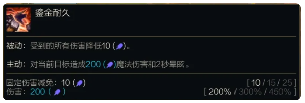 被动:受到的所有伤害降低(10/15/25)