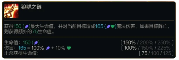 获得(150%/200%/250%法术强度)最大生命值,并对当前目标造成(100%/150%/225%法术强度 + 10%最大生命值)魔法伤害。如果目标阵亡,则获得额外的(75/100/125)生命值。
