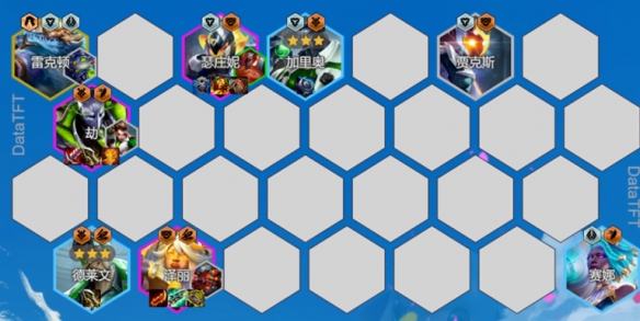雷克顿、瑟庄妮、加里奥和贾克斯在前排,劫放在鳄鱼后面,如果没有鳄鱼,就把劫放在加里奥的边上。