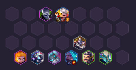 7级追卡的时候,两星皇子的坦度暂时不够,需要挂件在前排左右保护。皇子出三星后,就可以像图中8人口站位这样劫站旁边,牛头第二排,半单顶。第一波伤害让劫来吃,尤其是对方有点杀单位时。