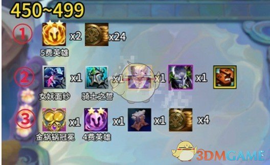 1、奖励一览:2个二星五费+24金币/1女妖+1骑士之誓+1盖伦+1劫+1拆卸/一个金锅锅冠冕+1个二星四费+1个成装锻造器+4金币。