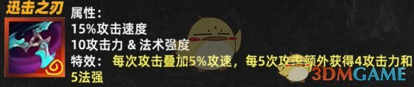 3、特效:每次攻击叠加5%攻速,每5次攻击额外获得4攻击力和5法强。