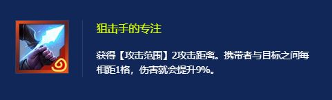 2、狙击手的专注鳄鱼:需要拿奥恩神器,并且神器为该装备,可以提供两格攻击距离,并且随距离增加伤害。