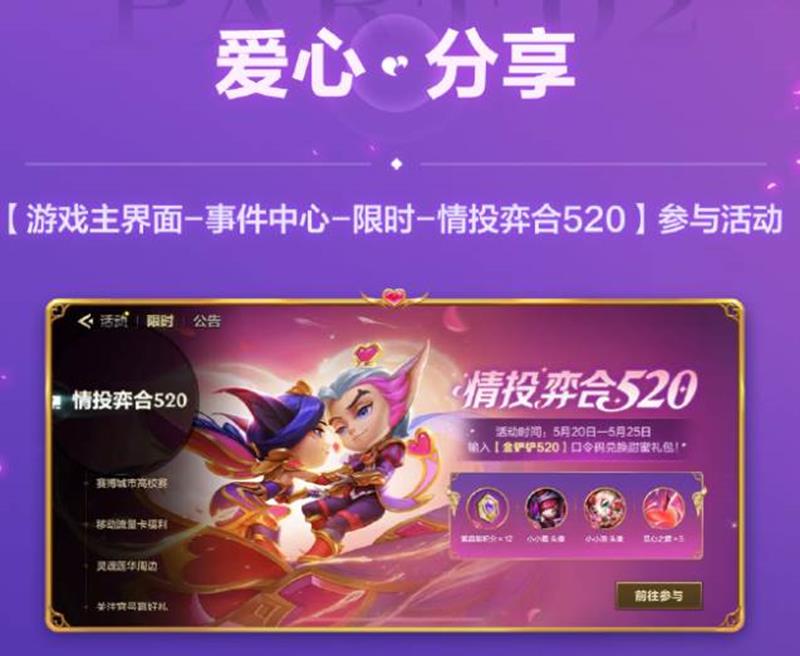 5月20日10点至5月25日24点,在游戏内-事件中心-限时-「情投弈合520」参与活动,输入【金铲铲520】,即可领取甜蜜礼包!