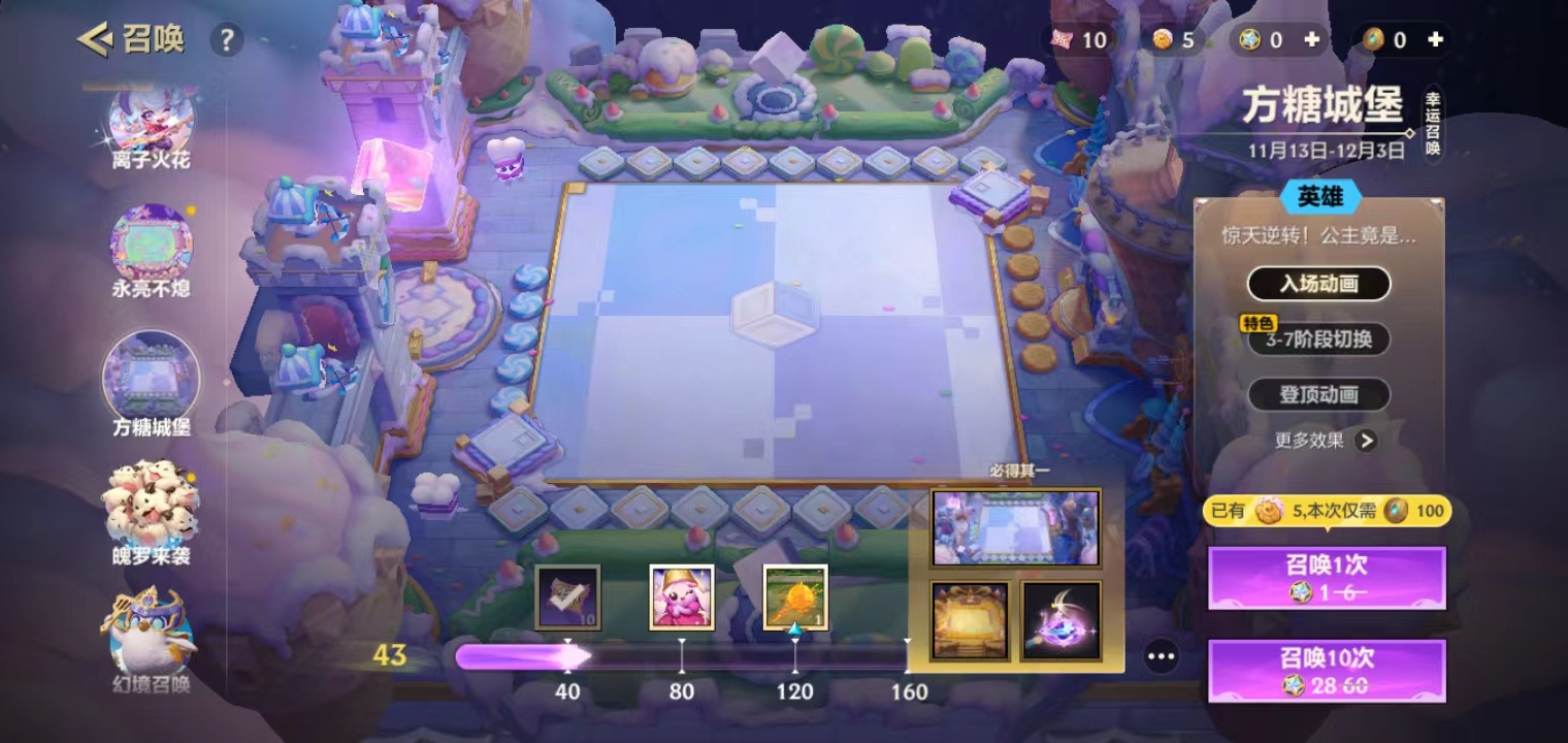 方糖城堡作为英雄级的棋盘,想要获取,那就需要看个人的运气。在幸运召唤中初始的概率是1%,实际测试下来,大部分的玩家在300多左右就可以保底出货并不算特别的坑。在这一次幸福召唤池中还会同步上线焦糖厨房,如果喜欢温馨风格的玩家也可以选择,但个人建议优先选择方糖城堡。毕竟阶段切换的独特设计,在后续的环节中,是不大可能会复刻的。这里也有一个小秘密要透露,建议积攒足够的召唤券之后,然后直接选择10连抽。相对而言,成功的几率就会更高一些。