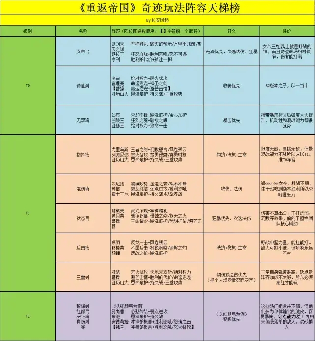 结合上面提到的占点机制、不死兵复活机制和符文系统,我整理了一套奇迹玩法阵容天梯榜,供大家参考。排名的主要依据是混战输出能力和坦度,如有疏漏之处欢迎大佬指正。