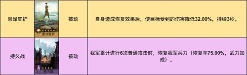 固有技能无上军心具有回复效果,此外还有概率附加1秒的抵御(无敌)状态,因其CD仅6秒,可搭配恩泽庇护增强队伍抗性。