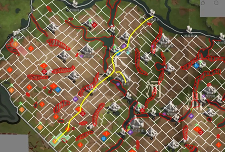西2线资源贫乏,正常推进无法抢到任何战略资源。唯一优势是推进最快,经济最好,在常规开局两个3级城的情况下,该线仅需拿下两个2级城就能达到,后续还能一路北上不管家门口4级城,直接推到5级要塞门口,是最容易抢下势力值榜一的路线。