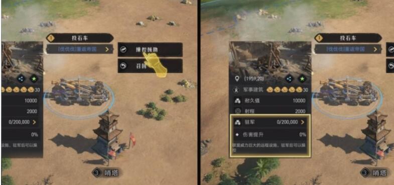 1、投石车抵达派遣的位置后,点击投石车便可派遣部队进驻,单个投石车也存在驻军的上限,投石车内的驻军越多,它所能造成的攻城伤害也会更高。