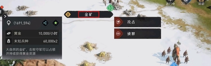 游戏中的资源点分为城内的建筑设施资源点以及城外的中立资源点的。而不管是城内还是城外,都是有着金矿这种重要的资源点。想要在城内采金,我们就需要专门制造采金矿并且安排村民进行劳作,而野外的金矿则需要我们击败蛮族或者是其他玩家进行占领,占领之后驻扎部队也是可以进行金矿的采集了。