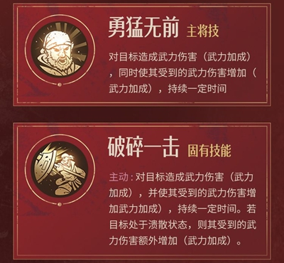 主动:对目标造成武力伤害(武力加成),并使其受到的武力伤害增加武力加成),持续一定时间。若目标处于溃散状态,则其受到的武力伤害额外增加(武力加成)