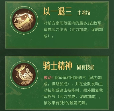 被动:我军每秒回复怒气(武力加成,谋略加成),并在全队发动主动技能或追击技能时,额外回复我军怒气(武力加成,谋略加成),该效果有3秒的触发间隔。