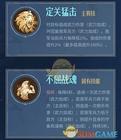 指挥:每隔6秒,造成一次武力伤害(武力加成)。若我军兵力高于敌方(主目标),则造成一次额外伤害(武力加成) ;若我军兵力低于敌方(主目标),则提升自身的守备和谋略(武力加成),持续3秒。