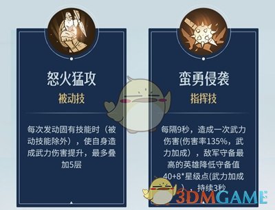 2、被动技能能提升武力伤害,最高叠加五层,指挥级9秒攻击一次。