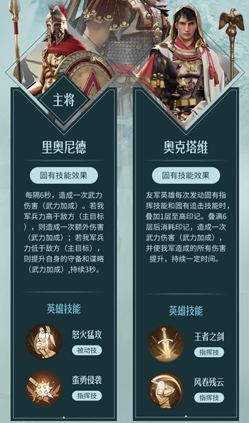 2、推荐搭配主将里奥尼德和奥克塔维,可以搭配很强的增伤技能,固定指挥。