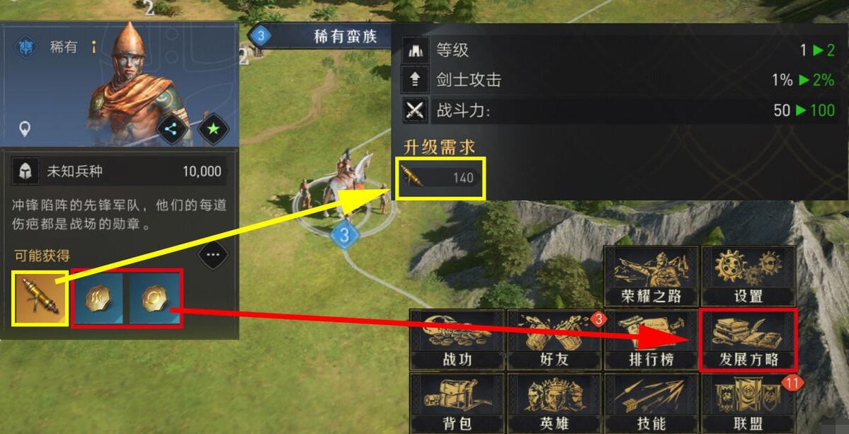 知识卷轴和发展方略的获取点相同,主要都是来自普通和稀有蛮族士兵,稀有蛮族每天只能击杀5次,大家每天要记得打哦。