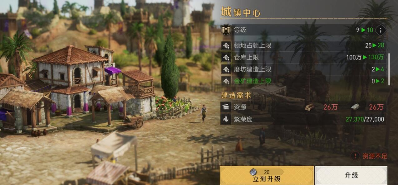 最初的几级消耗少,建设时间短,我们可以一次性升完,但是此后不建议升太多,因为短期内我们要尽可能把资源留给城镇中心。