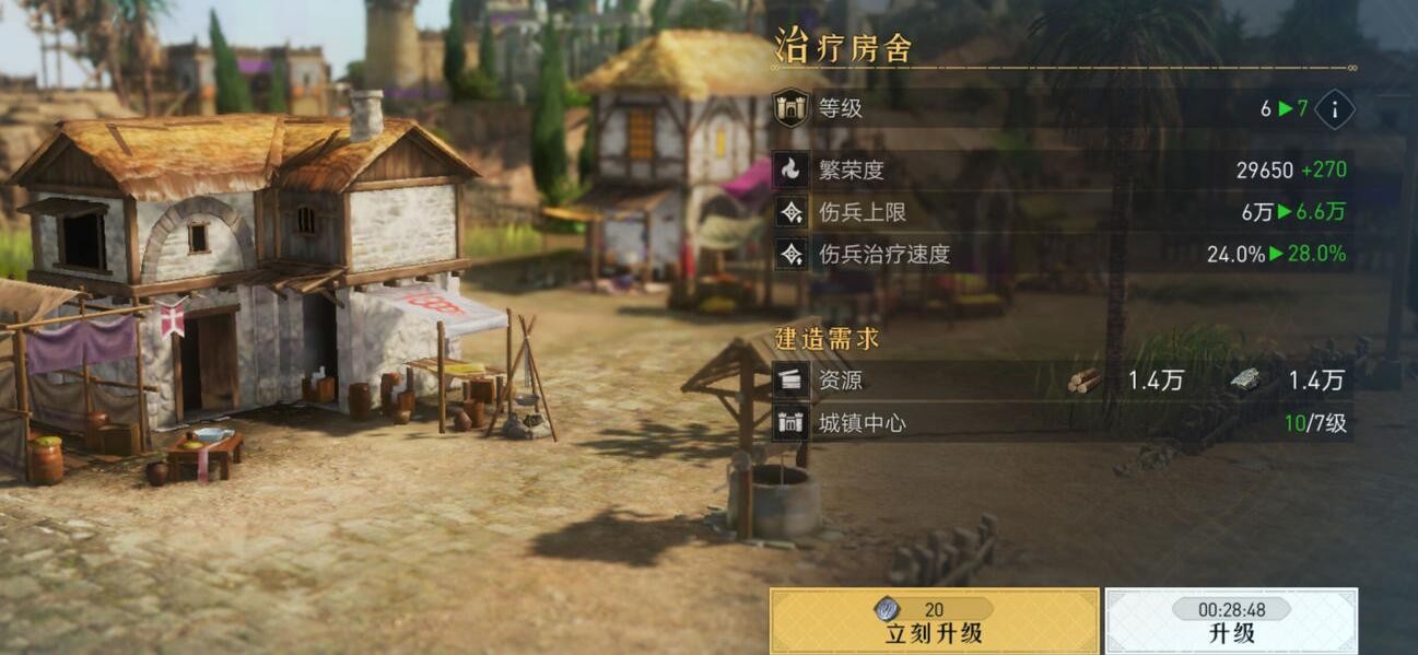 作为整个领地最重要的核心建筑,城镇中心中心的等级是其他所有建筑的上限。并且随着它的升级,我们还能开启更多的功能建筑,占领更多资源领地。包括至关重要的时代升级,也需要在城镇达到一定等级才能提升。