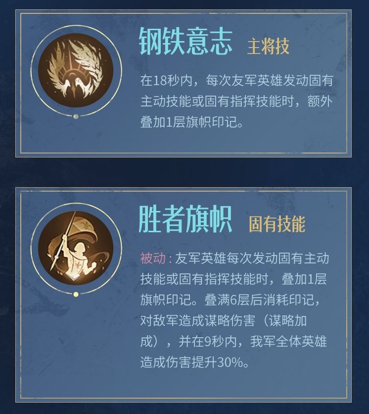 被动:友军英雄每次发动固有主动技能或固有指挥技能时,叠加1层旗帜印记。叠满6层后消耗印记,对敌军造成谋略伤害(谋略加成)。并在9秒内,我军全体英雄造成伤害提升30%。