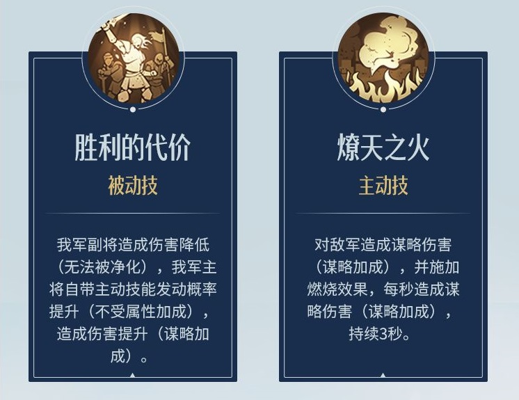 被动:我军副将造成伤害降低(无法被净化),我军主将自带主动技能发动概率提升(不受属性加成) 造成伤害提升(谋略加成)。