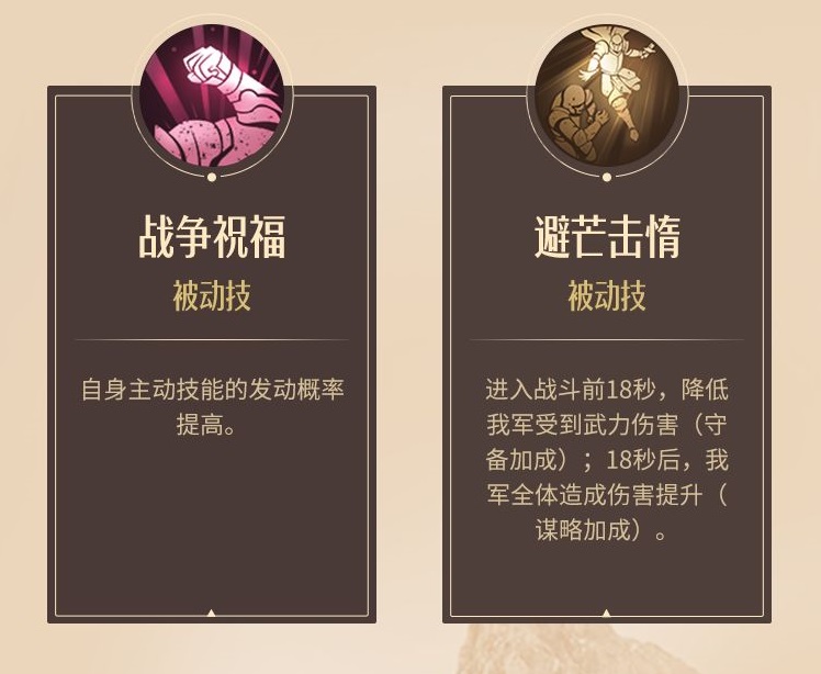 被动:进入战斗前18秒,降低我军受到武力伤害(守备加成) ; 18秒后,我军全体造成伤害提升(谋略加成)