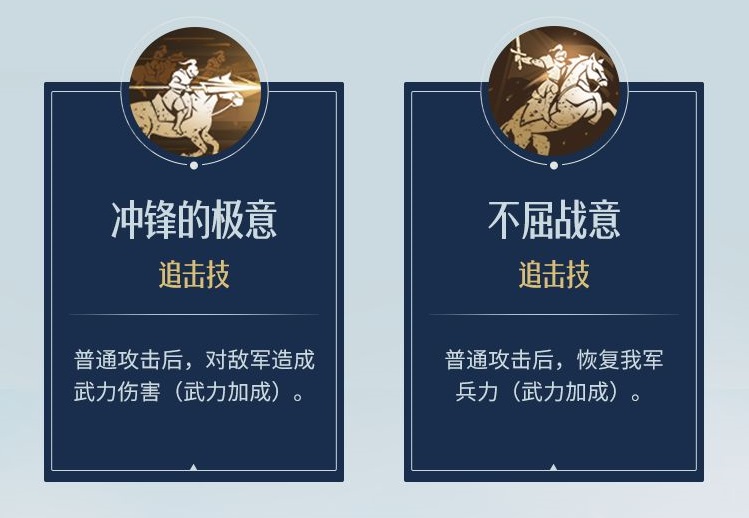 追击:普通攻击后,恢复我军兵力(武力加成)。