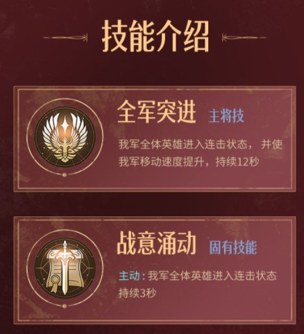 主要技能是全军突进和战意涌动