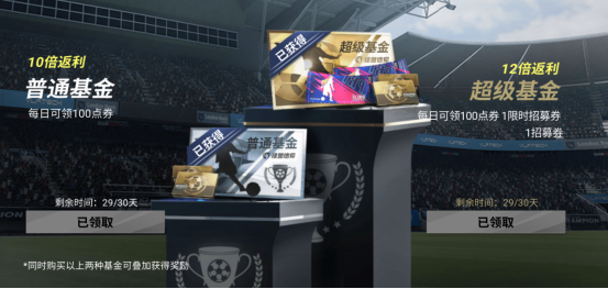月度基金:与通行证一样,是玩家稳赚不赔的充值选择,普通基金售价30元,共可领3300点券;超级基金售价68元,一个月可以多领30张招募券 & 30张限时招募券。