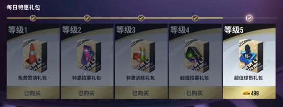 商城每日特惠礼包:分为五个等级,需依次购买。价格亲民但奖励丰富,包括训练锥、招募券、86+潜力球员包。