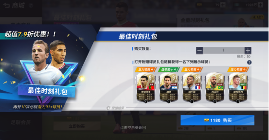 最佳时刻礼包:不用过多解释,看球员卡池就知道这是个非常容易出大货的礼包,梅西、C罗、姆巴佩、内马尔、德布劳内等等,当下足坛知名度最高的巨星已经在这里等待大家了。