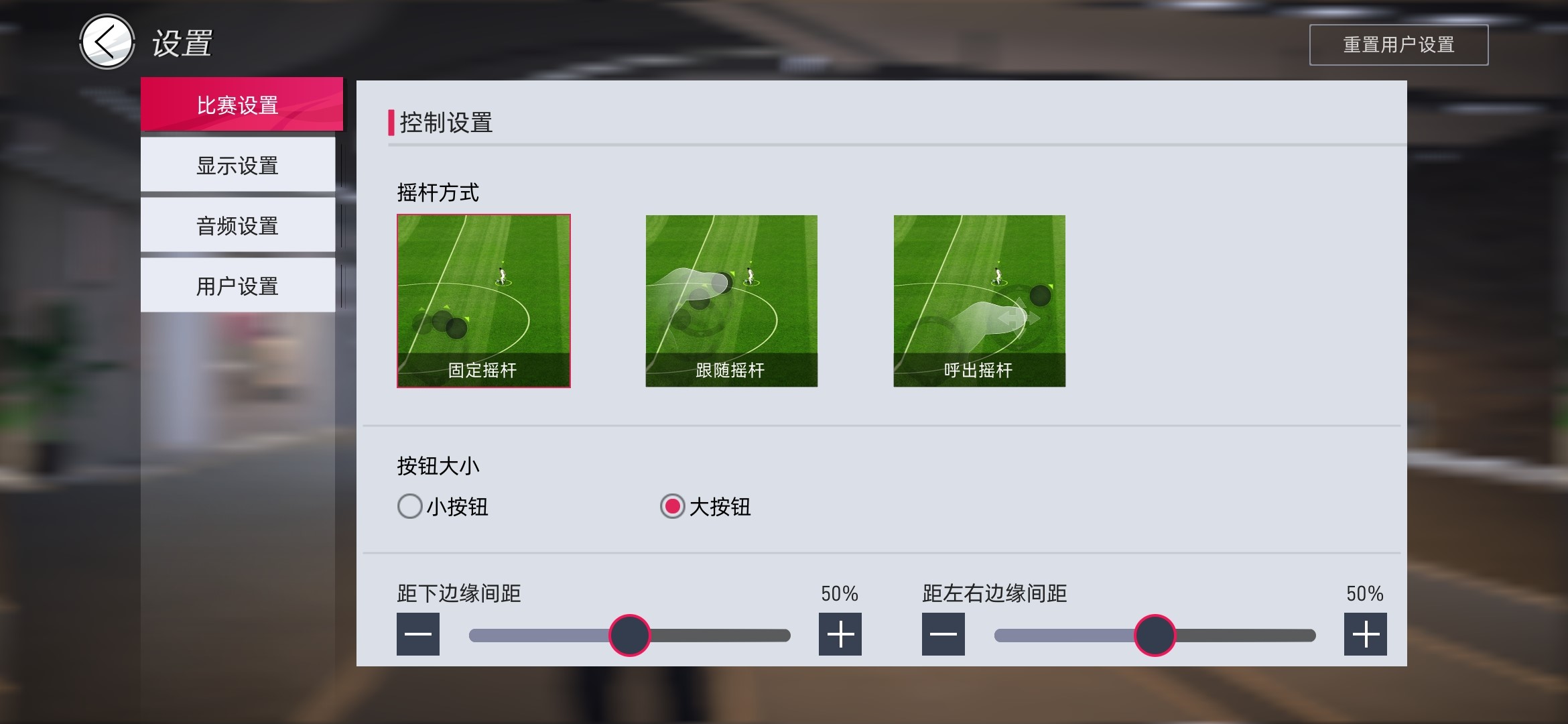 2、比赛设置,刚开始进入游戏,你可能会发现按键或者方向用着都很不习惯!没关系,点击主页右上角的展开按钮,点击“设置” “比赛设置”,游戏内操控的问题都可解决,包括一些自动设置,可以根据自己实际情况来选择设置。固定摇杆指的是游戏全程摇杆固定在一个位置,跟随摇杆指的是摇杆会跟随着玩家的手指来移动,呼出摇杆指的就是玩家随意在屏幕任何位置都可以唤出摇杆。 按钮大小就是在游戏中的“射门” “传球”这些按键的大小。自动切换操作和辅助操作,其实就是让ai帮你处理的一些东西,比如开启了“自动解围”,ai将会在合适的时候帮助你解围,不用你再点击解围。
