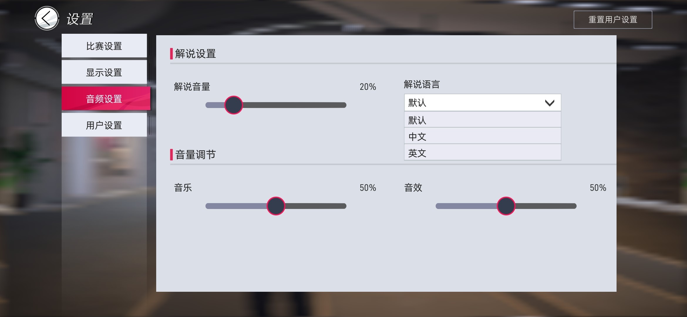 4、音频设置,可在此设置“解说音量” “解说语言” “背景音乐”以及“比赛音效”的音量,这款游戏的中文解说的确不错!比赛的时候那种感觉就像直播一样!强烈安利!