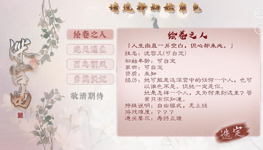 《深宫曲》是一款以古代宫廷为背景、后宫妃嫔为视角的高自由度、高随机性养成类文字互动作品。玩家可以自己选择自己的出身,或高贵或平庸,可以是初入宫闱的秀女,也可以是在冷宫中艰难求存的弃妃。那么游戏中新手如何玩呢?很多萌新开局就不知道该如何选,那么该怎么办呢?下面小编就给大家带来了《深宫曲》初始级新手玩法攻略,一起看看吧!