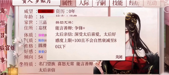 深受太后喜爱,太后好感度上限=100且不会自然衰减至80以下。
