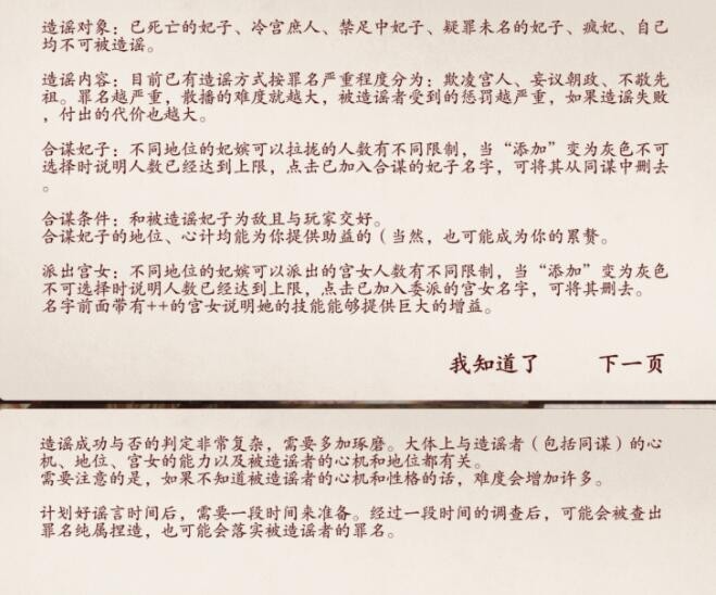 5.可同时筹备两次造谣,适用于一次造谣没什么效果,但两次造谣可以降位或打入冷宫的妃子