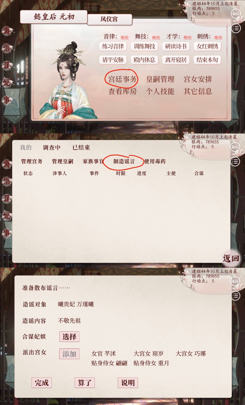 所以一定要控制造谣进度,此时花钱贿赂或派出高野心宫女阻挠调查。自己被造谣时,则助力提高调查进度。