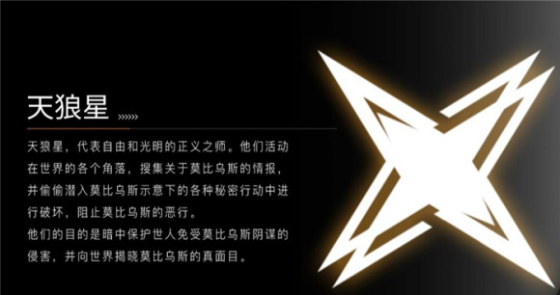 天狼星阵营是代表着光明与自由,他们的组队标志是夜空里面发出十字光芒最亮的恒星——天狼星。天狼星阵营的组织理念是:在各个世界角落里面暗中保护平民的人身安全,避免他们受到侵害,而且他们与莫比乌斯阵营是处于对立的。
