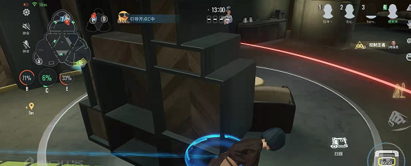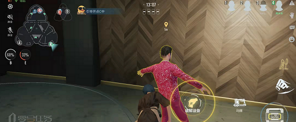 3、玩家靠近他之后,会有一个【破译设备】的交互键,玩家点击之后就可以蓝线连接npc来获取密码;