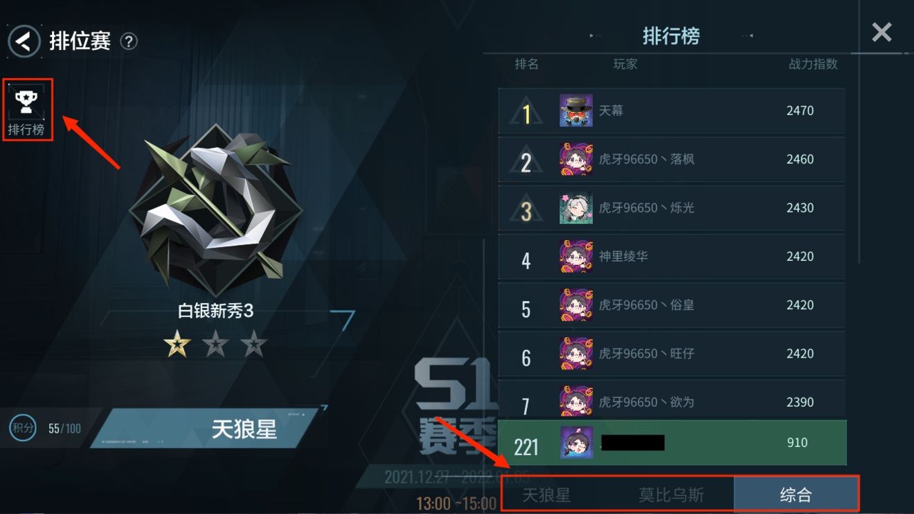 探员可以通过排位赛界面左上角的排行榜按键进入榜单查看自己的当前排名,或查看国服大神。排行榜按阵营分为天狼星、莫比乌斯以及综合排名。探员可通过右下角按键自由切换。