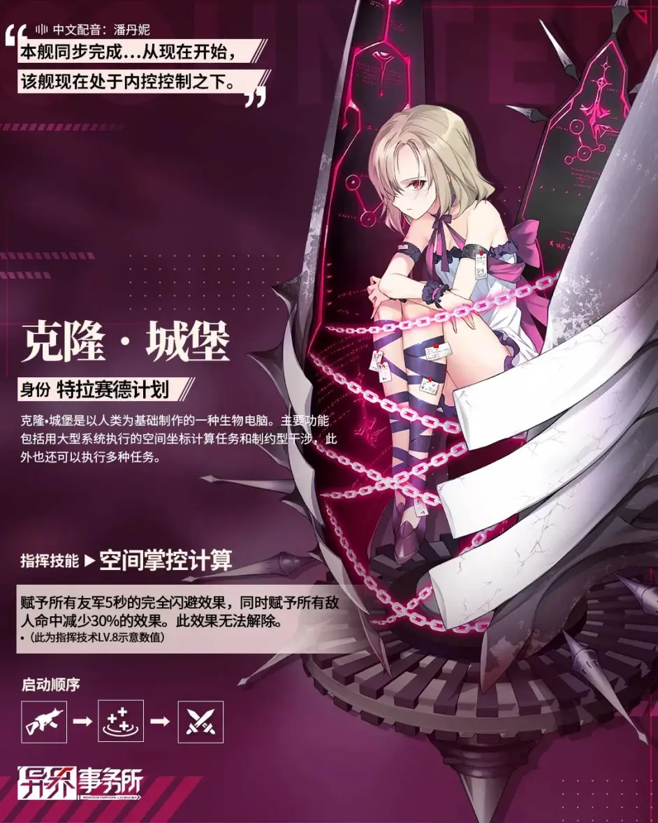“克隆·城堡”参与战役并发动指挥技能后,将赋予所有友军一定时间内的完全闪避效果,同时对敌方施加一定程度的命中减少效果,该技能效果无法被解除。