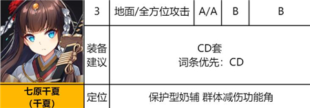 回复型辅助,出场能提供长时间优秀减伤效果,大招集回血加攻debuff于一体,功能全面但相对在回复能力上稍弱于专精回复的辅助角色,同样作为辅助色来说不推荐优先培养。