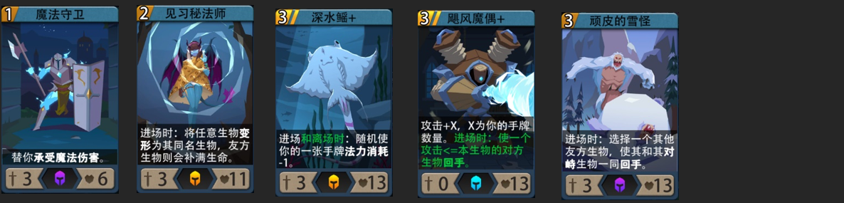 核心思路:当虎斑贝勇士占场时,以低费用回手卡回手虎斑贝对峙生物,保证抽卡效率。当卡组厚度不够,可加入魔法守卫,防止手牌自伤。