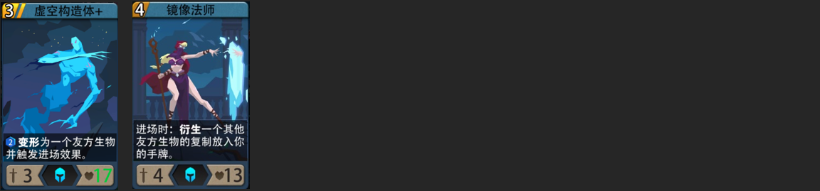 核心思路:通过虚空构造体+变形低费白嫖场上大哥的入场效果,同时也可以通过镜像法师,复制虚空构造体+或者大哥,保证手牌质量。