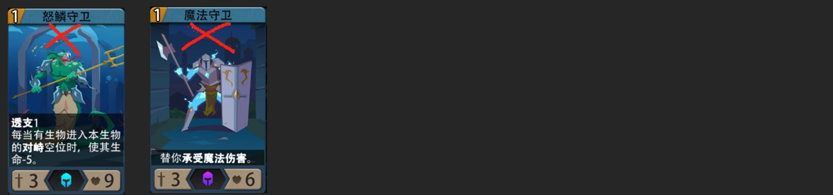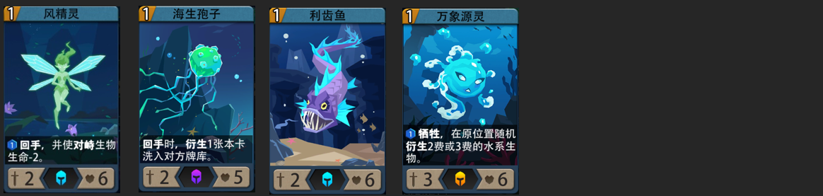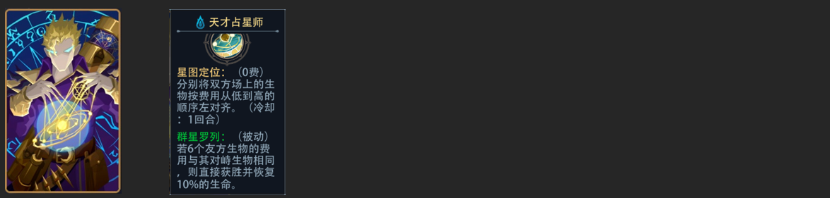 群星罗列:若6个友方生物的费用与其对峙生物相同,则直接获胜并回复10%的生命。