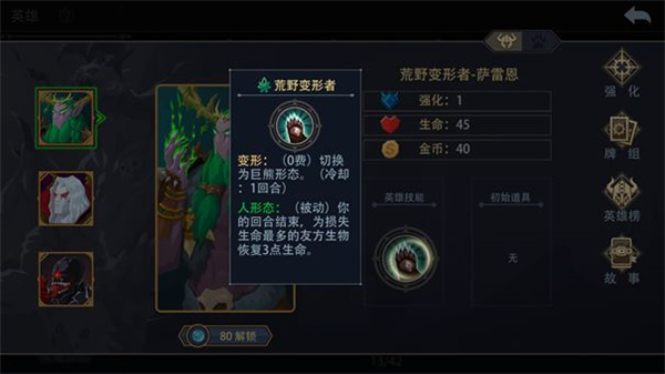 荒野变形者萨雷恩是该版本中唯一一个拥有2套技能角色的用户,各种形态下每回合可损失一个生命最多的生物恢复3点生命,熊形态下每当友方生物被确定为目标时,可使其本回合暂时+1-2的攻击力;