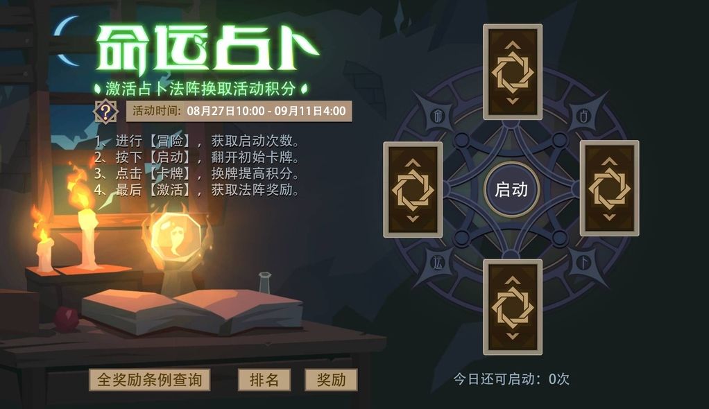 活动期间,勇士们在冒险中击败的每个精英和首领都会为玩家提供一次占卜次数。在活动界面消耗占卜次数即可开启法阵,根据玩家翻开的卡牌搭配提供给玩家一定的魔晶奖励。每日累计积分最高的玩家们还会根据排行榜名次获取额外奖励。